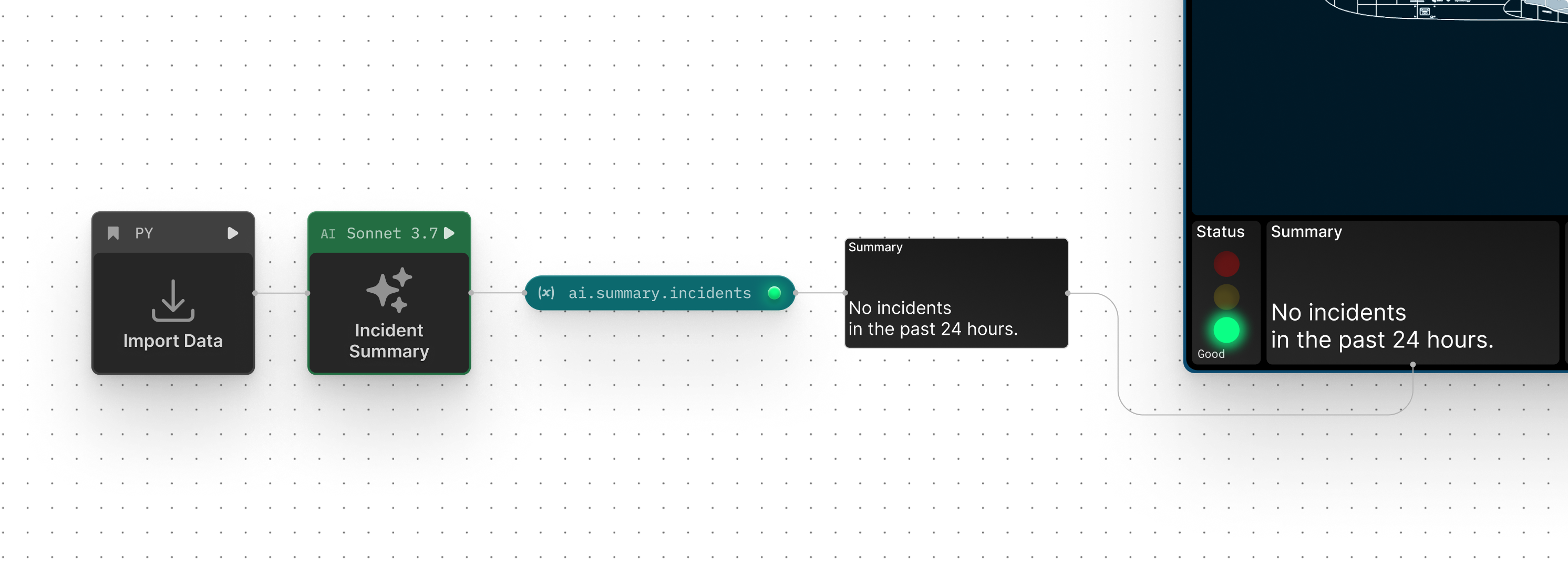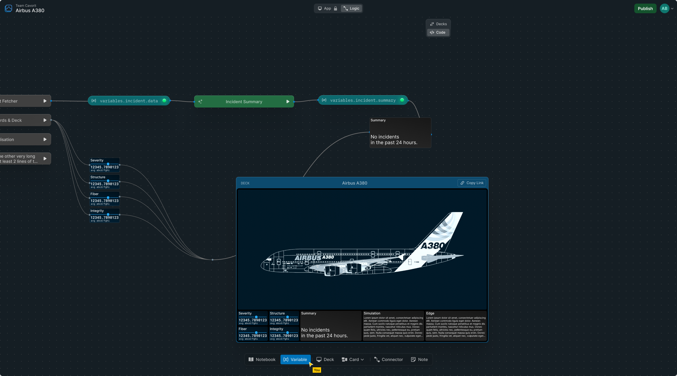 Bring notebooks, cards, and dashboards together on a dynamic process map — an infinite, multiplayer canvas like Mural or Miro. Collaborate on workflows and code, and break down silos, without ever switching tools.